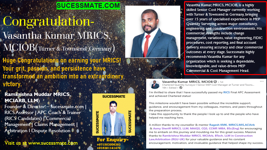 I am delighted to recommend Mr.Ramkrishna Muddar ,founder & director sucessmate for his outstanding support during my MRICS journey. He was my go-to mentor throughout the APC process, he offered clear, practical guidance on case-study development, patiently walked me through each stage, and ran focused QA sessions that addressed both technical detail and presentation technique.